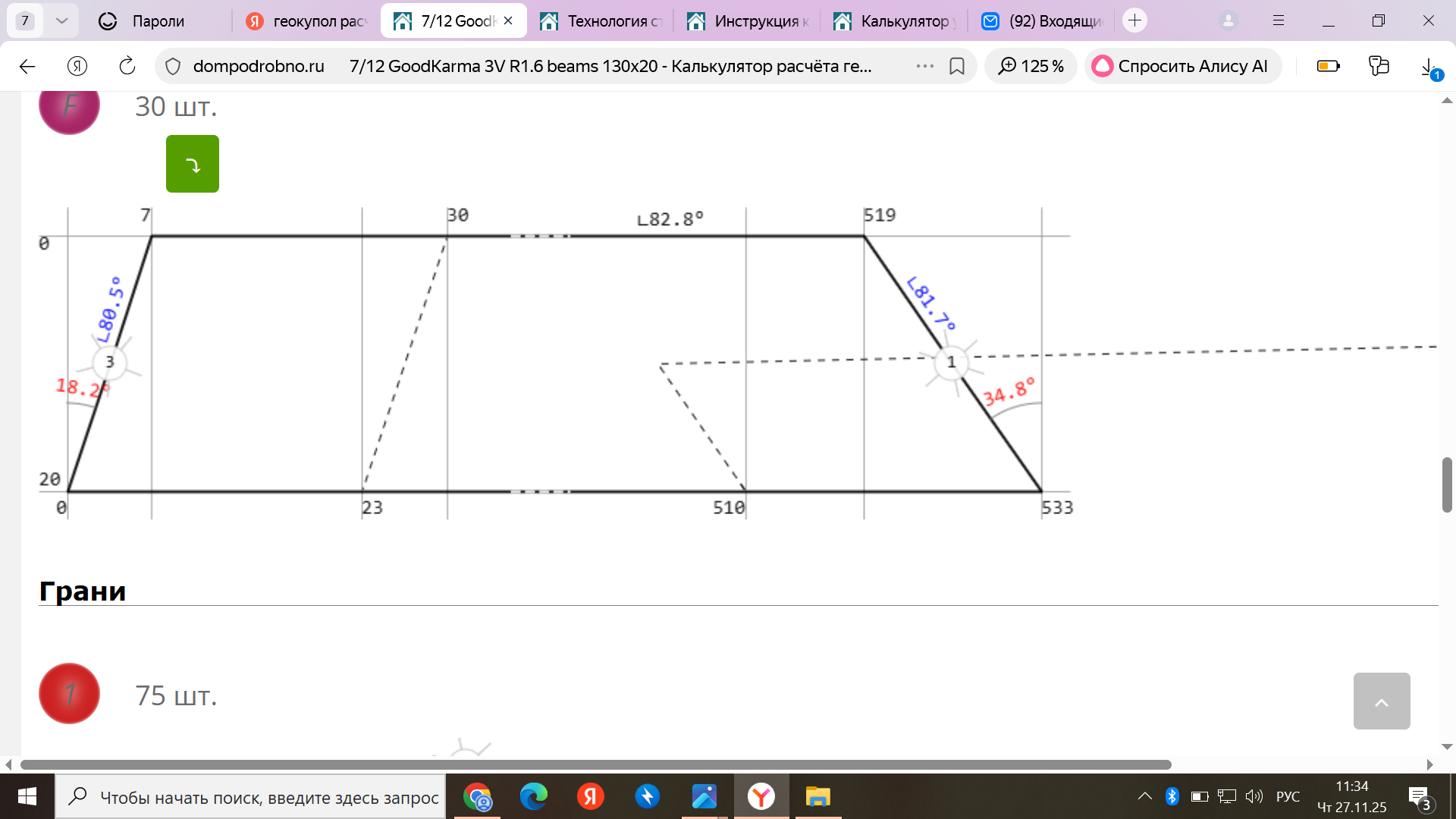 В блоке грани показаны вид, размеры и количество всех граней рассчитанного купола.